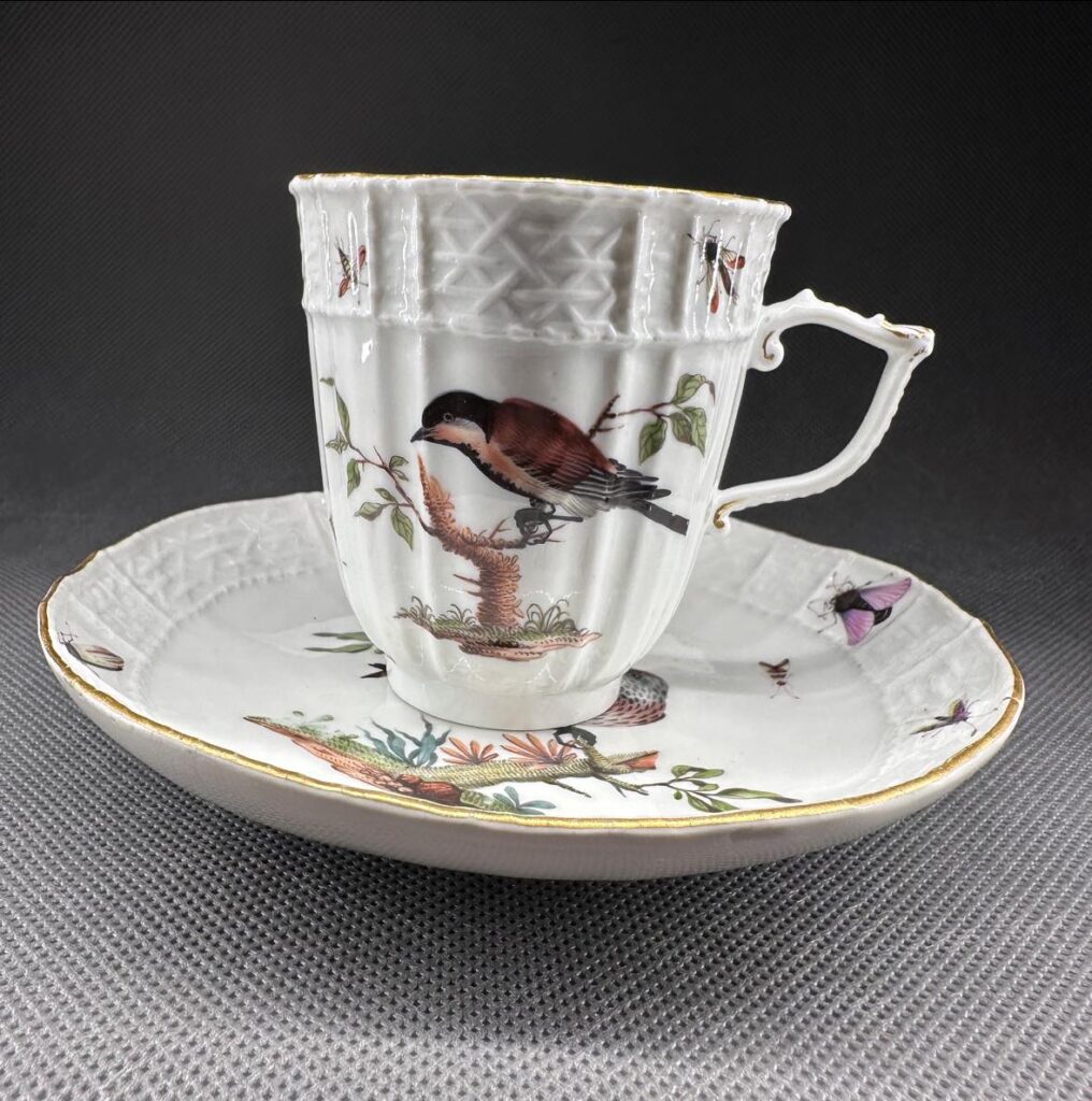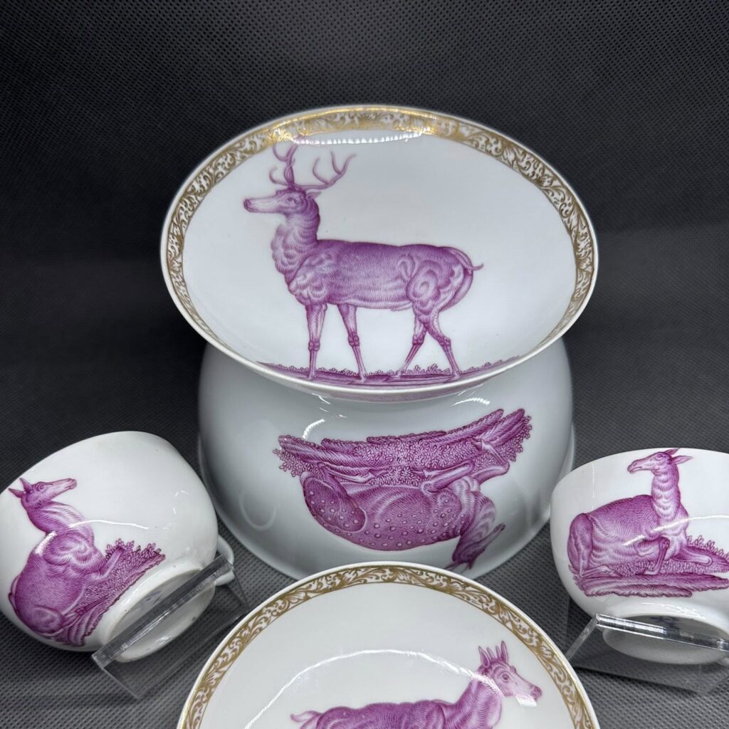 Królewska Miśnia, ok. 1763–1765 elementy serwisu herbacianego z monochromatyczną malaturą camaïeu w purpurze w manierze F.J. Fernera i bogatymi złoceniami arabeskowymi.