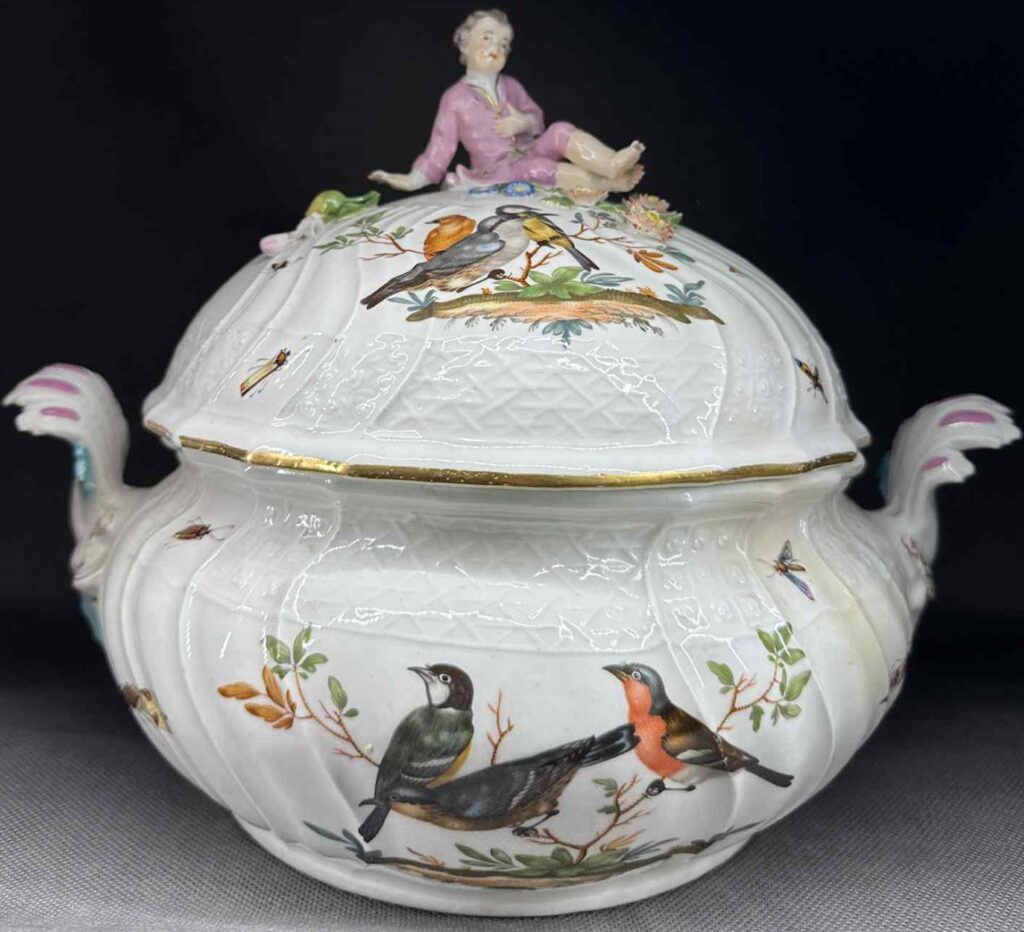 Królewska Manufaktura w Miśni, ok. 1755/60 r. – późnorokokowa waza z pokrywą w dekoracji ornitologiczno-entomologicznej, element serwisu obiadowego o reprezentacyjnej, plastycznie modelowanej formie.