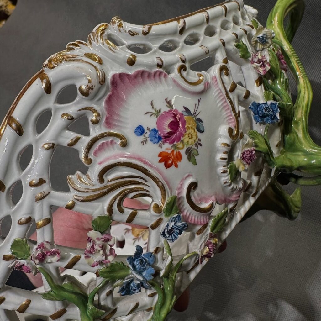 Kosz na owoce z ok 1780 r. Kosz na owoce z Królewskiej Manufaktury Porcelany w Miśni z ok. 1780 r. Owalny kosz osadzony na czterech nóżkach, dekorowany ażurowymi reliefami. Po bokach znajdują się uchwyty w formie stylizowanych pędów roślinnych. Ścianki kosza o ażurowej formie imitującej plecionkę, na dłuższych bokach umieszczono dwa reliefowe medaliony. Brzeg ozdobiony