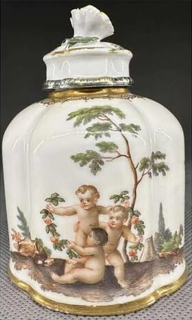 Herbatnica, pojemnik na susz herbaciany Królewska Manufaktura Porcelany w Miśni, ok. 1750 r Herbatnica, inaczej pojemnik na susz herbaciany. Prawdopodobnie była elementem serwisu dejeuner. Forma koniczna, zaoblona w górnej części , o wysokiej, wąskiej szyjce, zwieńczonej koniczną przykrywką z uchwytem w formie pąku kwiatowego. Dekoracja herbatnicy obejmuje dwie główne sceny figuralne rozmieszczone na przeciwległych ściankach