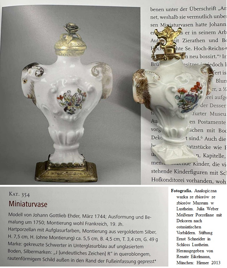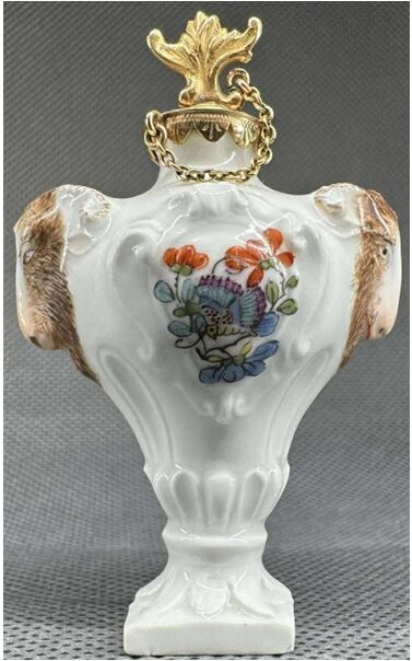 Miniaturowa waza w formie amfory o wtórnej funkcji pojemnika na perfumy, dekorowana wzorem motylim (niem. Chinesischer Schmetterling) w duchu chińskiego famille verte (rodzina zielona).