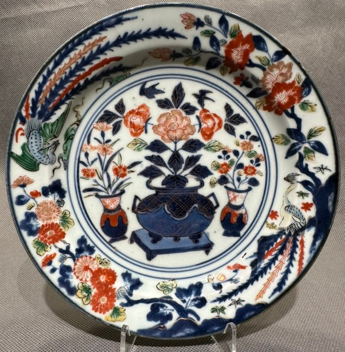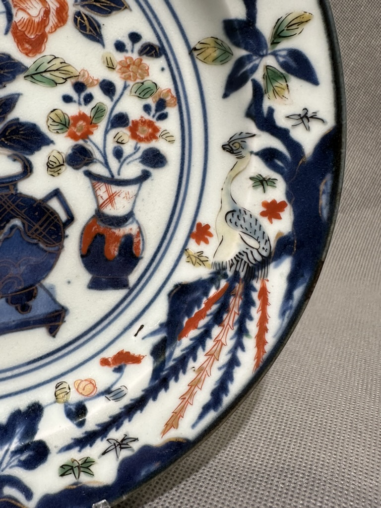 Na spodzie widoczny jest wyryty znak inwentarzowy Pałacu Japońskiego „N:345 +”, z zachowanymi śladami czarnego barwienia. Talerz zwraca uwagę grubym szkliwem oraz bogatą, wielobarwną dekoracją emaliowaną w kolorach zielonym, żółtym, czerwonym i błękitnym, dodatkowo podkreśloną złoceniami. W centrum przedstawiono duże, dwuuszne, trójnożne naczynie ustawione na niskim stole, otoczone kwiatami chryzantem. Po bokach znajdują się smukłe wazy z kwiatami, prawdopodobnie goździkami. Na kołnierzu talerza pojawia się motyw ptaka Hōō, czyli japońskiego mitycznego feniksa, bliskiego chińskiemu Fenghuangowi, ukazanego na przemian z ukwieconymi gałęziami. Według tradycji Hōō ukazuje się w czasach pokoju i dobrobytu, a jego pojawienie się zapowiada nową, pomyślną epokę. Motyw ten często występuje na japońskiej porcelanie z końca XVII i początku XVIII wieku, zwłaszcza w wyrobach typu Kakiemon, ale spotykany jest również w dekoracjach Imari, jak w tym przypadku.