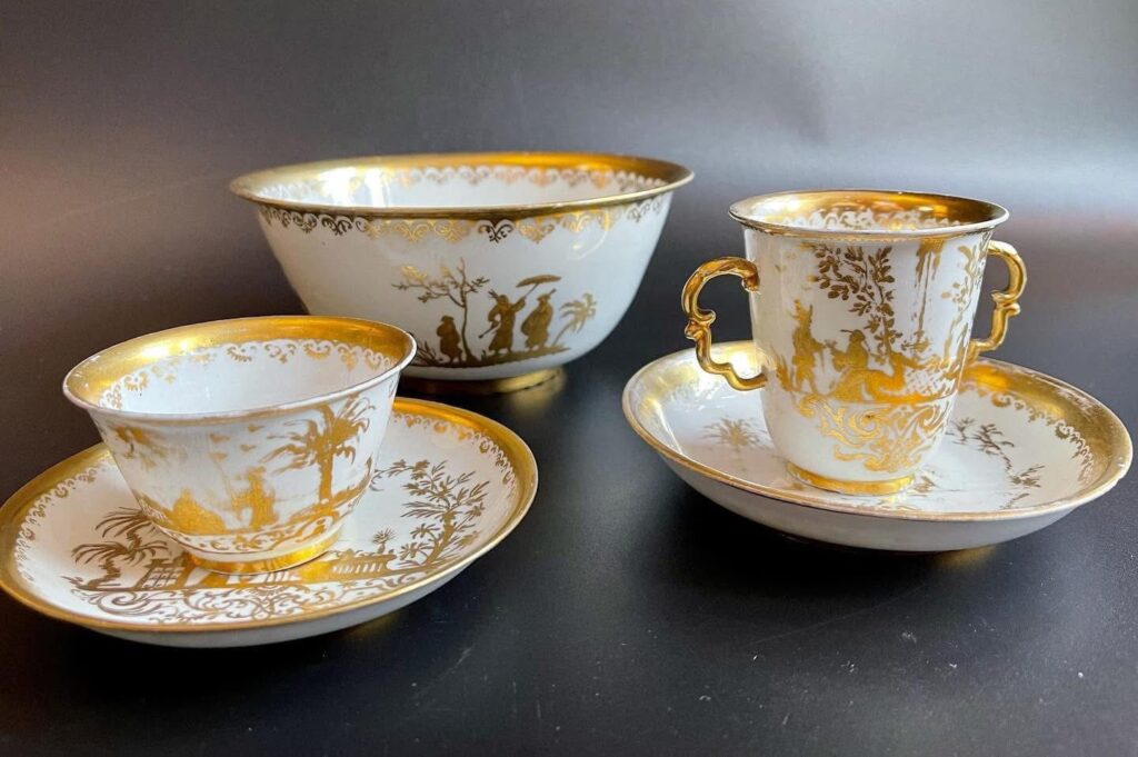 To właśnie ta porcelana stanowi europejską odpowiedź na porcelanę chińską (po wcześniejszych nieudanych próbach i produkcji porcelany miękkiej we Włoszech i Francji) – i od razu odznaczała się niezwykle oryginalnymi dekoracjami. Najczęściej spotykana jest seria gold chinoiserie, wykonywana przez augsburskich złotników, m.in. Abrahama i Bartholomäusa Seuterów oraz Johanna Aufenwertha (poniżej jedyny w Polsce przykład pracy tego artysty z jego podpisem- wkrótce w Muzeum Florian Radziej). Początkowo bowiem tylko złotnicy posiadali odpowiednią technikę zdobienia porcelany – był to czas sprzed opracowania emalii naszkliwnych przez Johanna Gregora Höroldta.